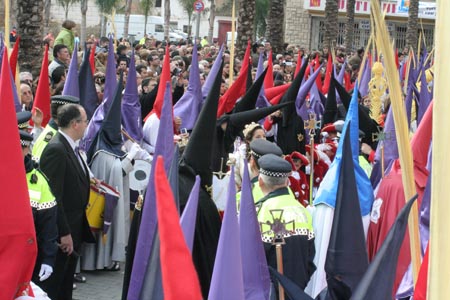 IMAGEN 2: Tradicional «momento tapón» del Domingo de Resurrección. Tres hermandades a la vez, la Reina, los pajes, la hermandad de la reina, la policia local, lo de la Central en un metro cuadrado y cada uno hacia una dirección.