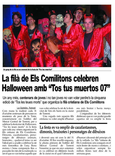 Com mana la tradició cada 31 d’octubre centenars de persones es reuniren als peus de la Torre, concretament en l’edifici del Mercat Central de Torrent, per a celebrar la festivitat de Halloween. “Tos tus muertos” és la festa que cada any vénen organitzant la filà critiana de Els Comilitons.