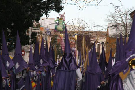 Todos la iban buscando, unos medio en broma y otros como único propósito para ir a ver pasar a las distintas hermandades en la procesión de Domingo de Ramos. Era la foto. De hecho, por momentos incluso tuve la duda de cuál era el motivo exacto de algunos para ver la procesión, si la entrada triunfal, el «burro de la Faz», el traje de la Reina, las mini-camareras o la foto. Tras la misa (almuerzo para mí), al bajar en marcha rápida, percibí claramente, que la foto era la estrella del día. Al acercarnos a la esquina en que pasaríamos junto la Falla Avenida, cerca de una decena de personas nos esperaban con cámaros en mano para inmortalizar el berlanguiano momento: vestes i falles en el mismo plano. Fue empezar a pasar y multitud de flashes.