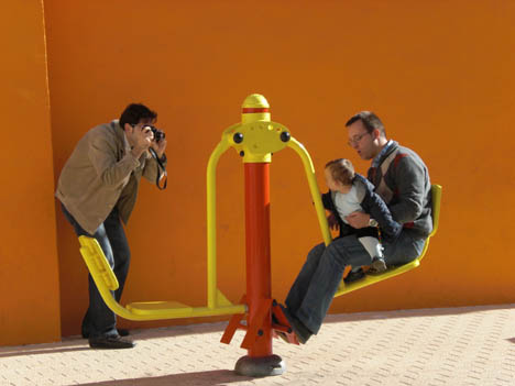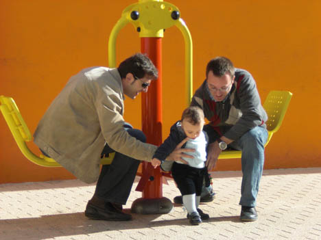 Y ahí lo tienen, ante ustedes, cual pareja de padres gays, a unos primerizos tíos sufriendo/disfrutando en el parque a lo padres forzosos con el escurridizo de Guillem.
