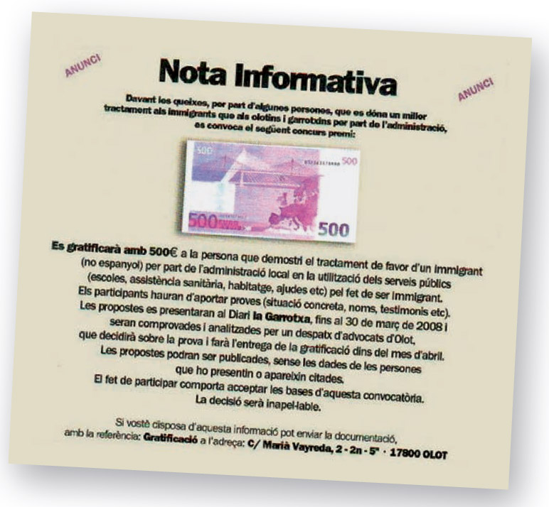 Ayer, en pleno braimstorming del consejo de redacción de Papers Associatius, me contaban el intento de un vecino de Olot de acabar con el mito, extendido por todos, incluido usted y yo mismo, de que los inmigrantes reciben trato de favor.