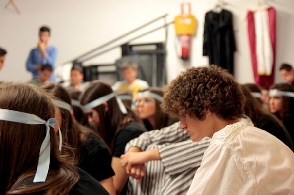 Quedan 15 minutos. Oscuridad total en el escenario. No hay nadie. Sólo un rumor creciente de voces. Es el público. Al otro lado del telón hay expectación. Nervios. Ilusión. Los camerinos, en penumbra, también aperecen vacíos. Silencio absoluto. Descendiendo las escaleras se ubica el sótano. Justo bajo el escenario. Allí, reunidos, sentados en el suelo, se encuentran todos. Actores, actrices y técnicos. La cuenta atrás se sitúa ya en 10 minutos. Los nervios son inmensamente mayores que en las butacas. Una voz habla. El resto escucha. Casi sin respirar. Muchos miran al suelo. Otros cierran las ojos. 5 minutos. Todos se cogen de la mano. Se escucha un rezo. Un momento único. Indescriptible. Una unidad total. Todo finaliza con un grito. 80 voces que son un clamor. Que se repiten. Que estremecen. Se abre la puerta. Se abrazan. Salen. Emocionados. Dispuestos a darlo todo. Una linterna marca el camino. La oscuridad que precede a la luz. Al estruendo. A la gloria. Cada uno se coloca en su posición. El humo envuelve ya el escenario. El patio de butacas enmudece. El silencio se puede cortar. Se abre el telón. La música arranca. Se vislumbra una tenue luz azulada. Unas formas se mueven. Se arrastran por el suelo. Empieza el show.